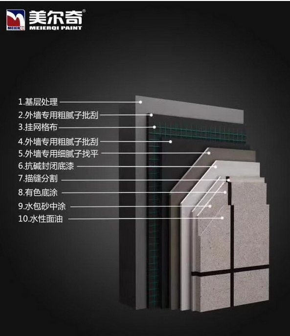 基層處理→外墻專用粗膩子批刮→掛網(wǎng)格布→外墻專用粗膩子批刮→外墻專用細膩子找平→抗堿封閉底漆→描縫分割→有色底涂→水包砂中涂→水性面油.png)