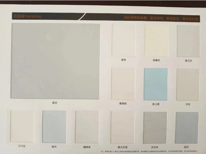 瑪曼奴作為可調(diào)色的礦物墻面涂料,可塑性極強,質(zhì)感豐富且飽滿,具有超強的透氣性,仿佛墻面會呼吸一樣,賦予了空間更舒適的環(huán)境,能夠有效的防霉防潮,超強的硬度能夠打造石材質(zhì)感的獨特天然空間,耐摩擦性能也更加優(yōu)越。