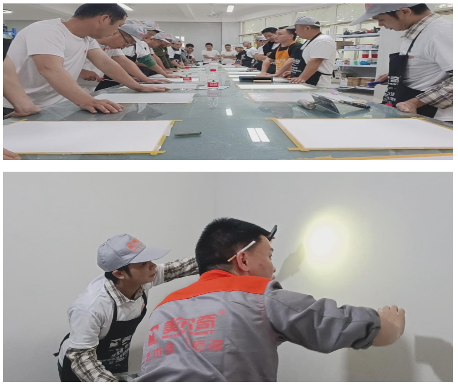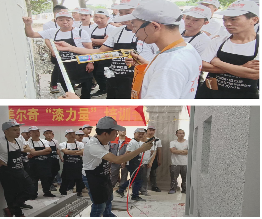 除了經(jīng)銷商門店突圍的思維點撥,工匠的實操培訓(xùn),也是此次漆力量商學(xué)院培訓(xùn)的一大亮點。區(qū)別于以往單項的實操培訓(xùn),此次工匠培訓(xùn)以提升綜合技能為目的,開設(shè)了圍繞外墻EPS構(gòu)件安裝、新工藝教學(xué)、仿石漆新品實操以及圍繞內(nèi)墻多款藝術(shù)漆主流產(chǎn)品實操教學(xué),真正做到將外墻一體化以及內(nèi)墻一體化相結(jié)合的模式,大大提升了工匠的綜合技能,打破了工匠以往技能單一的局面。此次工匠培訓(xùn)采用縮小版別墅實體為單位分組,各小組負(fù)責(zé)整棟別墅的內(nèi)外墻施工。在3天的培訓(xùn)時間內(nèi),通過工匠的巧手將毛坯的別墅實體演變成了一棟棟讓人嘆為觀止的精品。值得一提的是,此次藝術(shù)漆實操還加入了多款公司最新開發(fā)的藝術(shù)漆新品,其中微貝石和紫云煙這兩款產(chǎn)品,深受此次參訓(xùn)工匠的青睞,不僅成品效果突出,適用于大多數(shù)生活場景,而且在施工便利性方面,更是深受工匠們的喜愛。