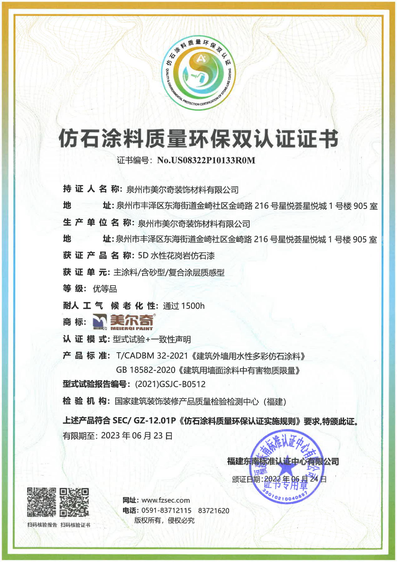 2022年率先獲得“仿石涂料質(zhì)量環(huán)保雙認(rèn)證”,其中環(huán)保指標(biāo)覆蓋VOC、甲醛釋放量、重金屬含量等12項(xiàng)關(guān)鍵參數(shù),認(rèn)證等級(jí)為“優(yōu)等品”,成為行業(yè)首批達(dá)標(biāo)企業(yè)。