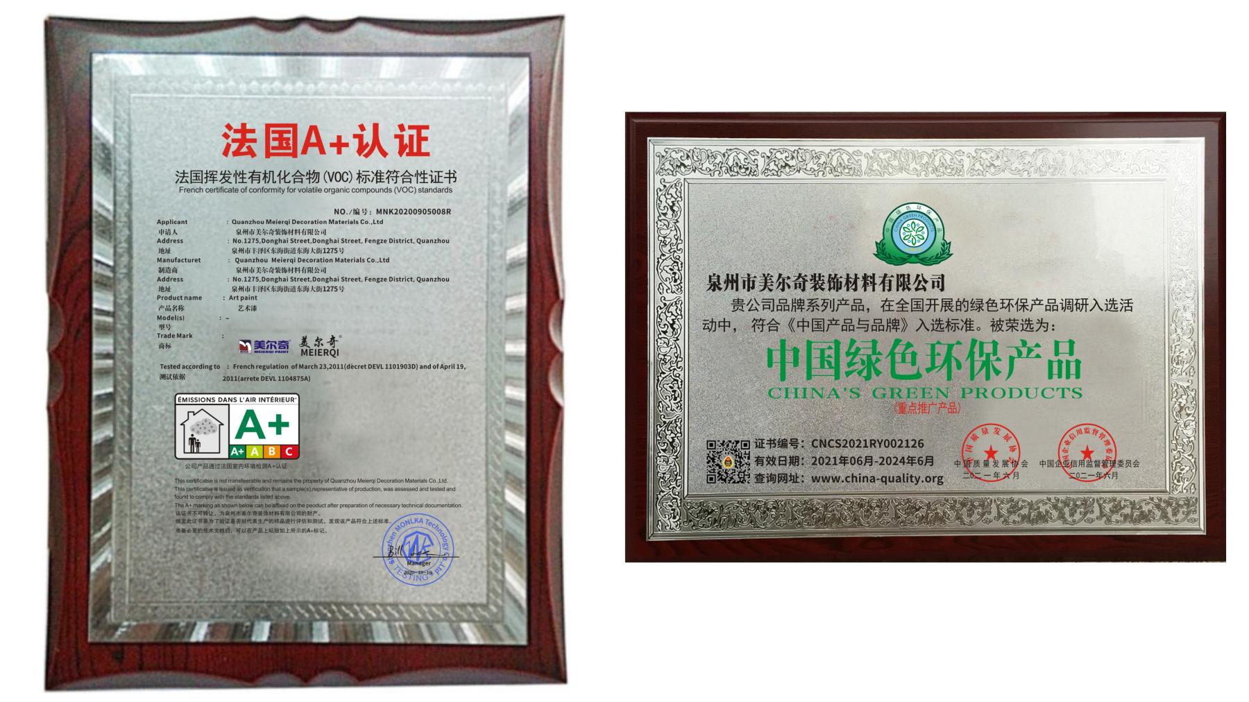 產(chǎn)品通過(guò)法國(guó)VOC A+認(rèn)證(室內(nèi)空氣質(zhì)量最高標(biāo)準(zhǔn)),符合歐盟REACH法規(guī)要求。美爾奇系列產(chǎn)品,符合《中國(guó)產(chǎn)品與品牌》入選標(biāo)準(zhǔn)。被容選為“中國(guó)綠色環(huán)保產(chǎn)品”。